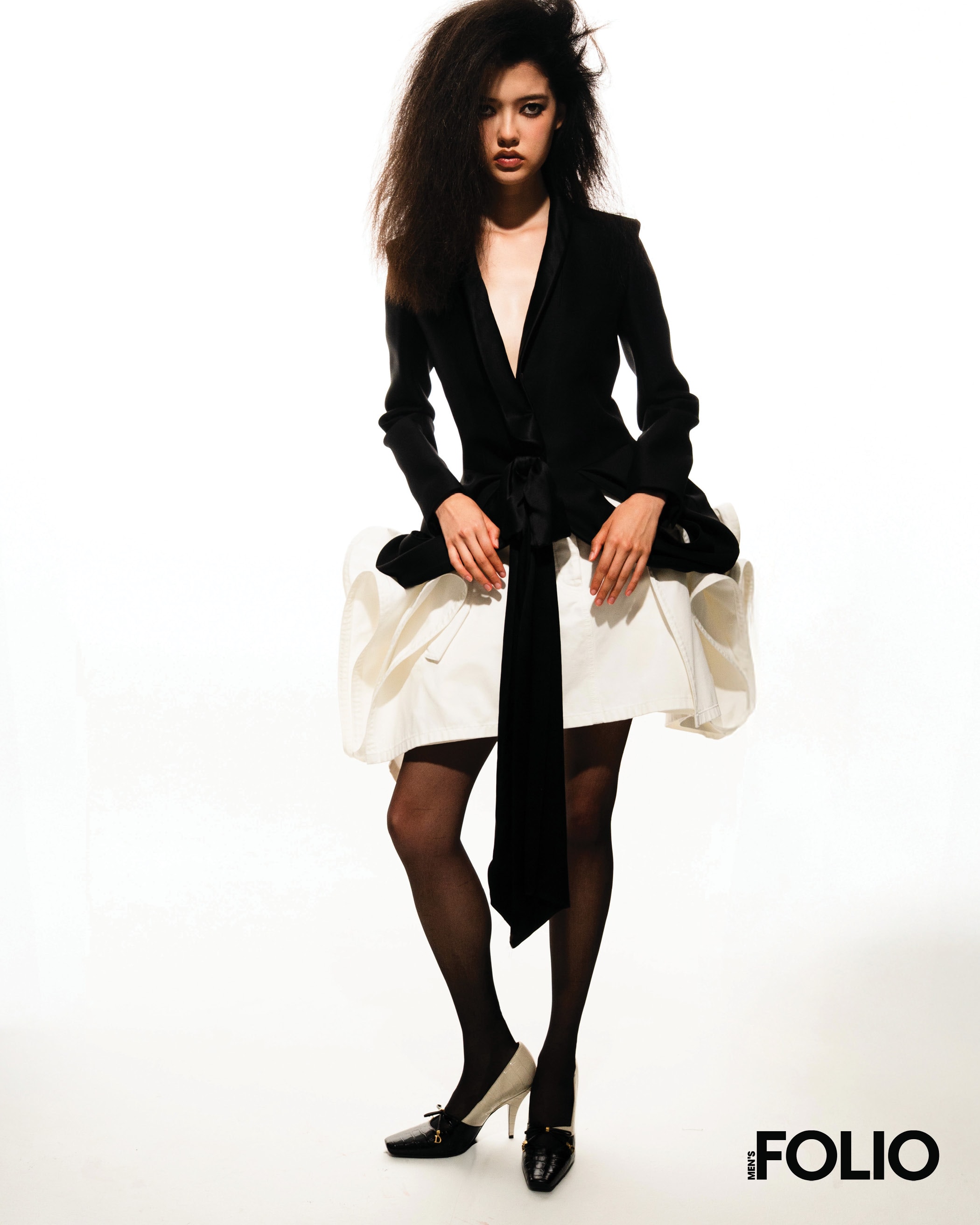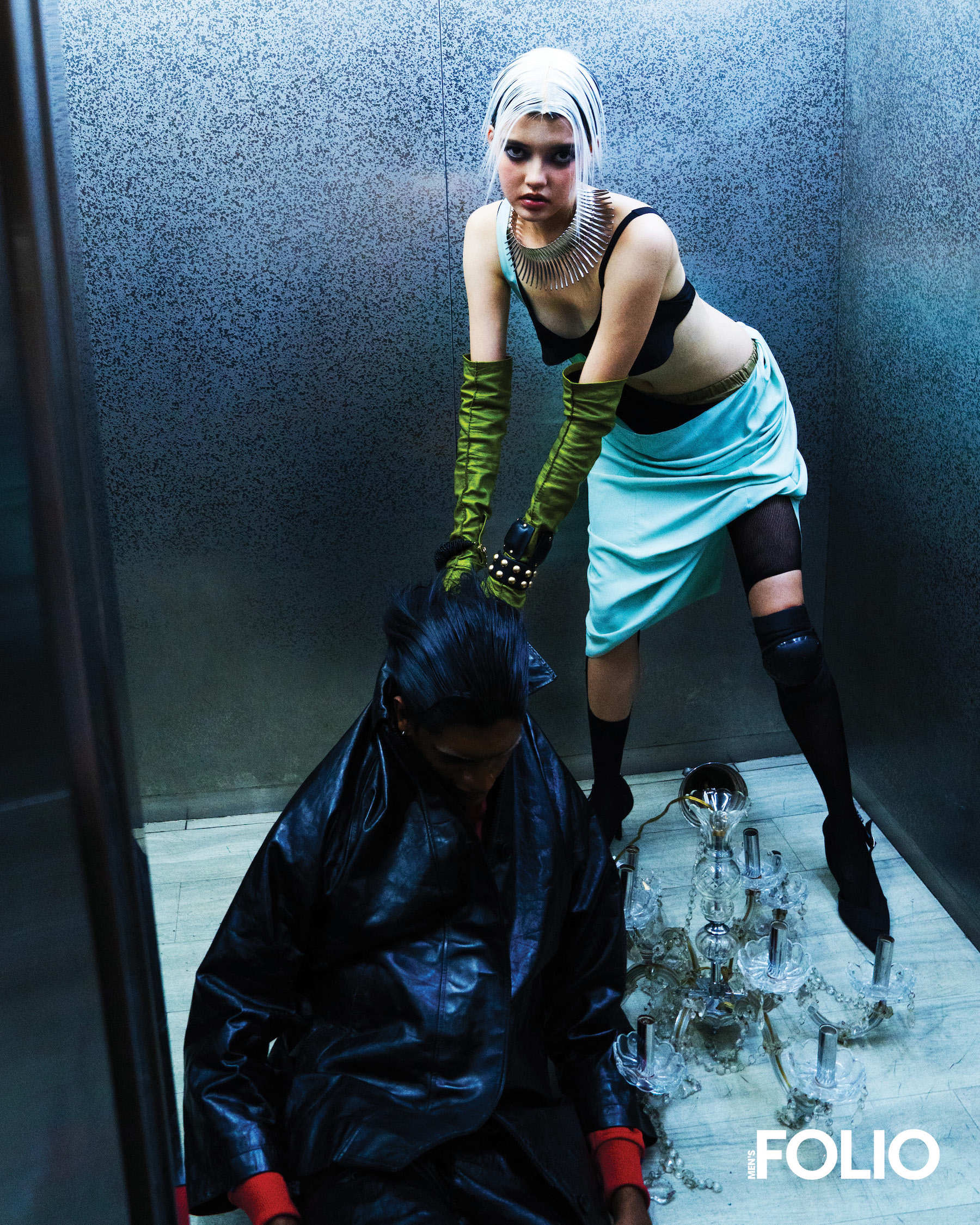 (About Lili) Bra, dress, shorts, gloves, heels, everything. Prada; Necklace, bracelets, stockings, knee protector, all Stylist’s own jackets (contracted), all Prada; Pants, the stylist’s own.