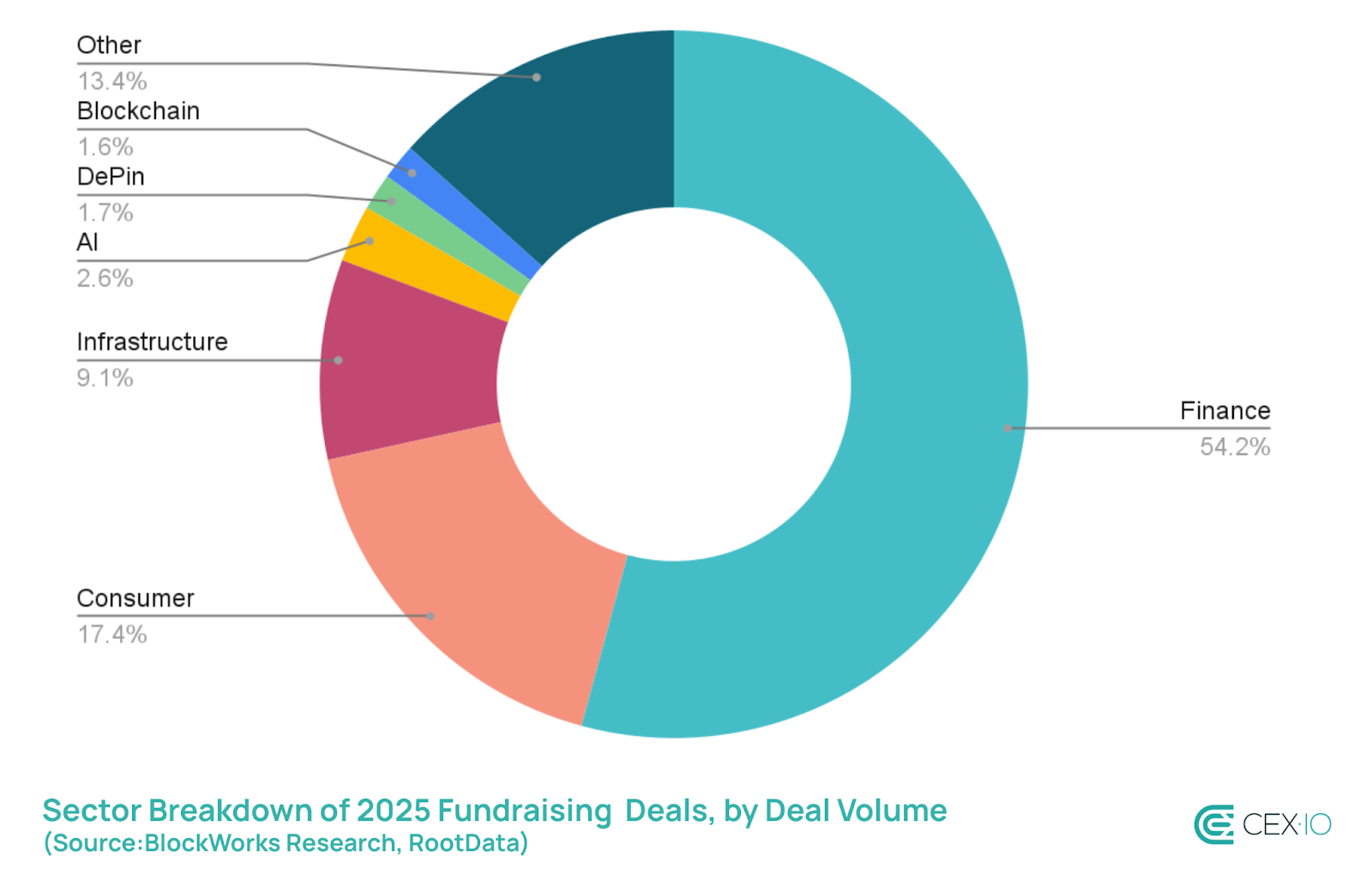 Instead of AI, the majority of funds in 2025 were allocated to finance-related projects (exchanges, stablecoins, tokenization, etc.), totaling more than $19 billion. Consumer applications (prediction markets, games, wallets, etc.) came in second place with more than 6 billion dollars, while infrastructure (hardware, security tools, bridges, etc.) completed the top three with more than $3 billion.