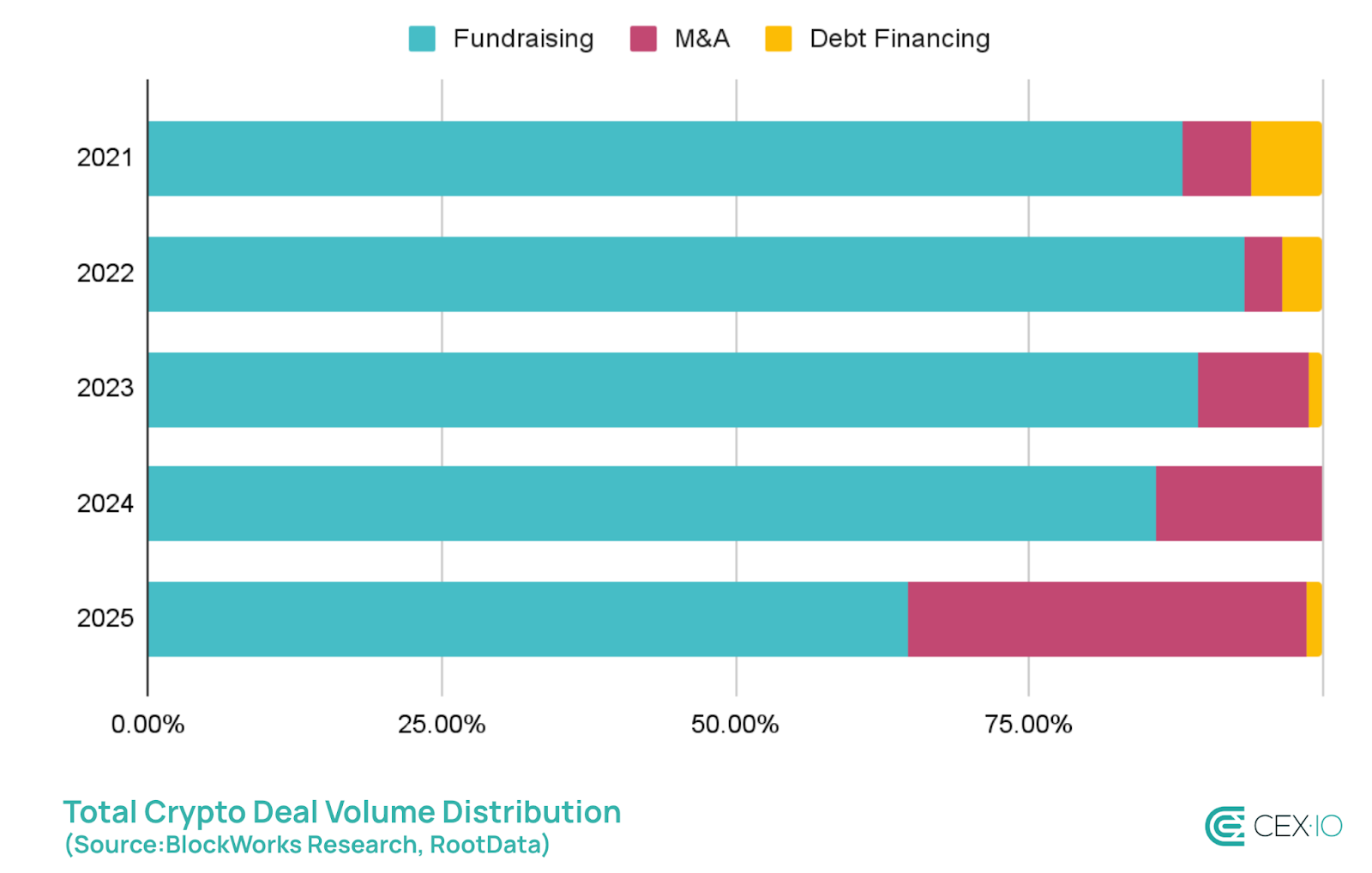 In 2025, the crypto industry saw a rapid and unprecedented increase in M&A volume and count. First, it’s important to note that M&A data is less transparent than fundraising data. While 140 cryptocurrency mergers and acquisitions recorded in 2025about 86% of them did not reveal the amount of the transaction, which makes it difficult to estimate the real value of the sector’s activity.