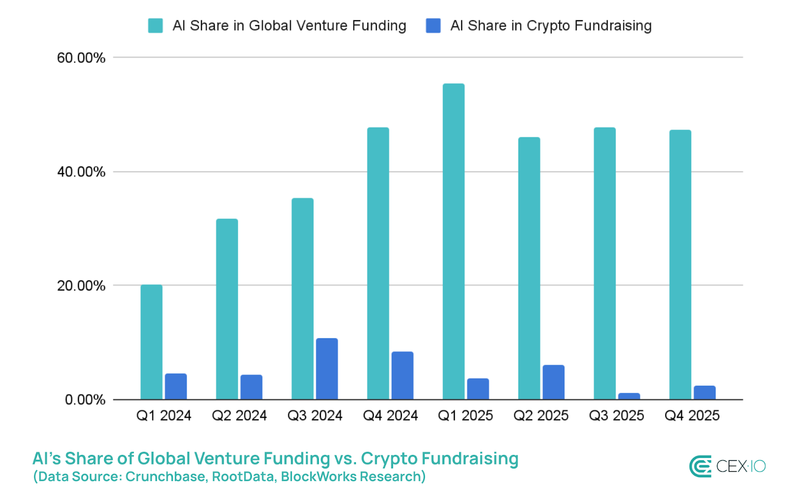 One of the most notable divergences between cryptocurrencies and the broader risk markets is their lower exposure to AI. While AI accounts for roughly half of all global venture funding, its share within cryptocurrencies has continued to shrink, falling from 7% of total crypto fundraising in 2024 to just 2.6% in 2025.