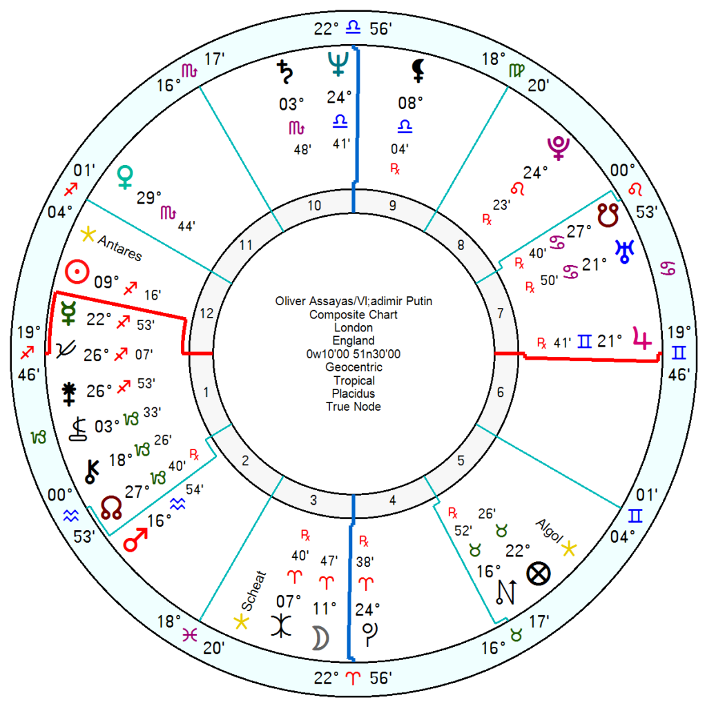 Director Olivier Assayas, January 25, 1955 at 11 a.m. in Paris, is an Aquarius Sun with Moon Mercury in Aquarius opposition Pluto square Saturn, making him a tenacious and determined individual. His relationship chart with Putin also has a composite opposition of Mars, Pluto, with bitter dislike and power struggle, so no love lost there either.