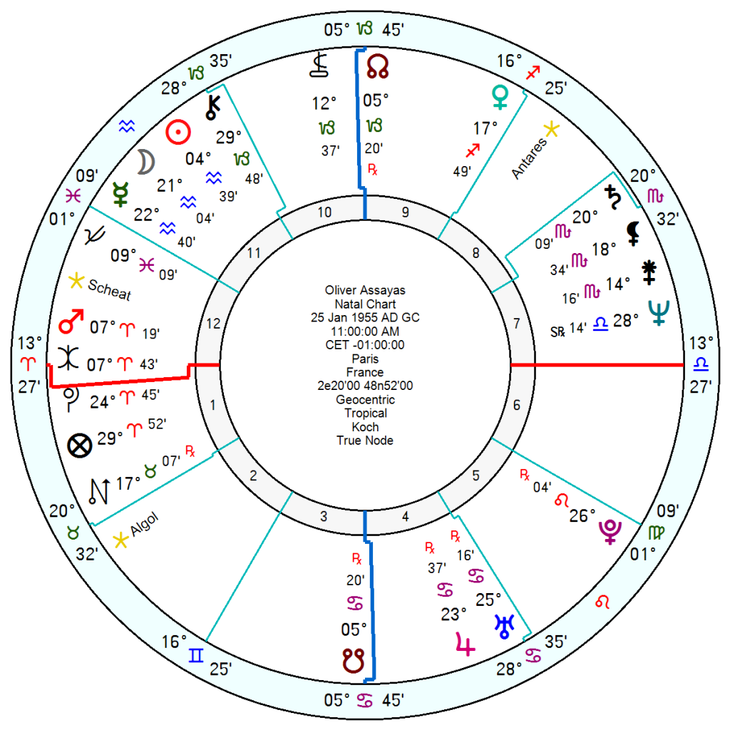 Assayas has a challenging tr Pluto conjunct his Sun in 2026/27; and an accident-prone Saturn conjunct his Mars in Aries this December and a panicked Neptune conjunct his Mars in 2027, not a progressive time for him, to put it mildly.