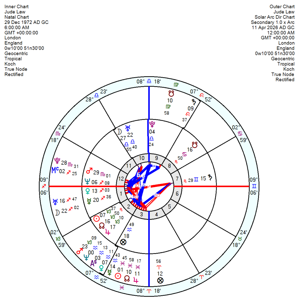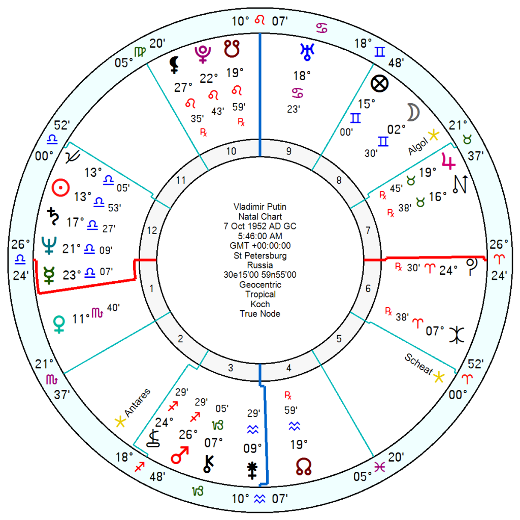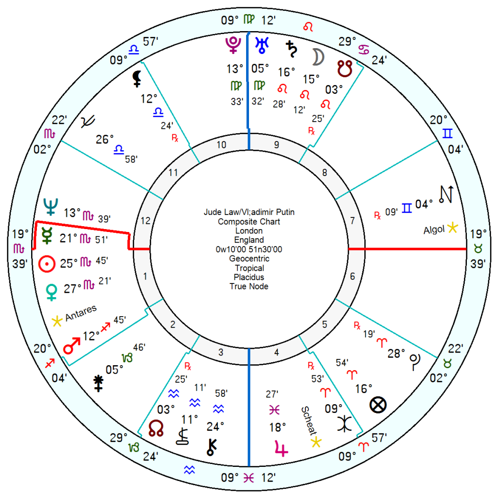 Putin, assuming the birth chart of October 7, 1952, has a Sun in Libra, Saturn, Neptune and Mercury in Libra, so there will be a degree of understanding from their shared Libra branch that may be contrary. Putin’s ruthless Mars in Sagittarius trine Pluto is also mirrored in diluted form by Jude Law’s Mars in Scorpio sextile Pluto.