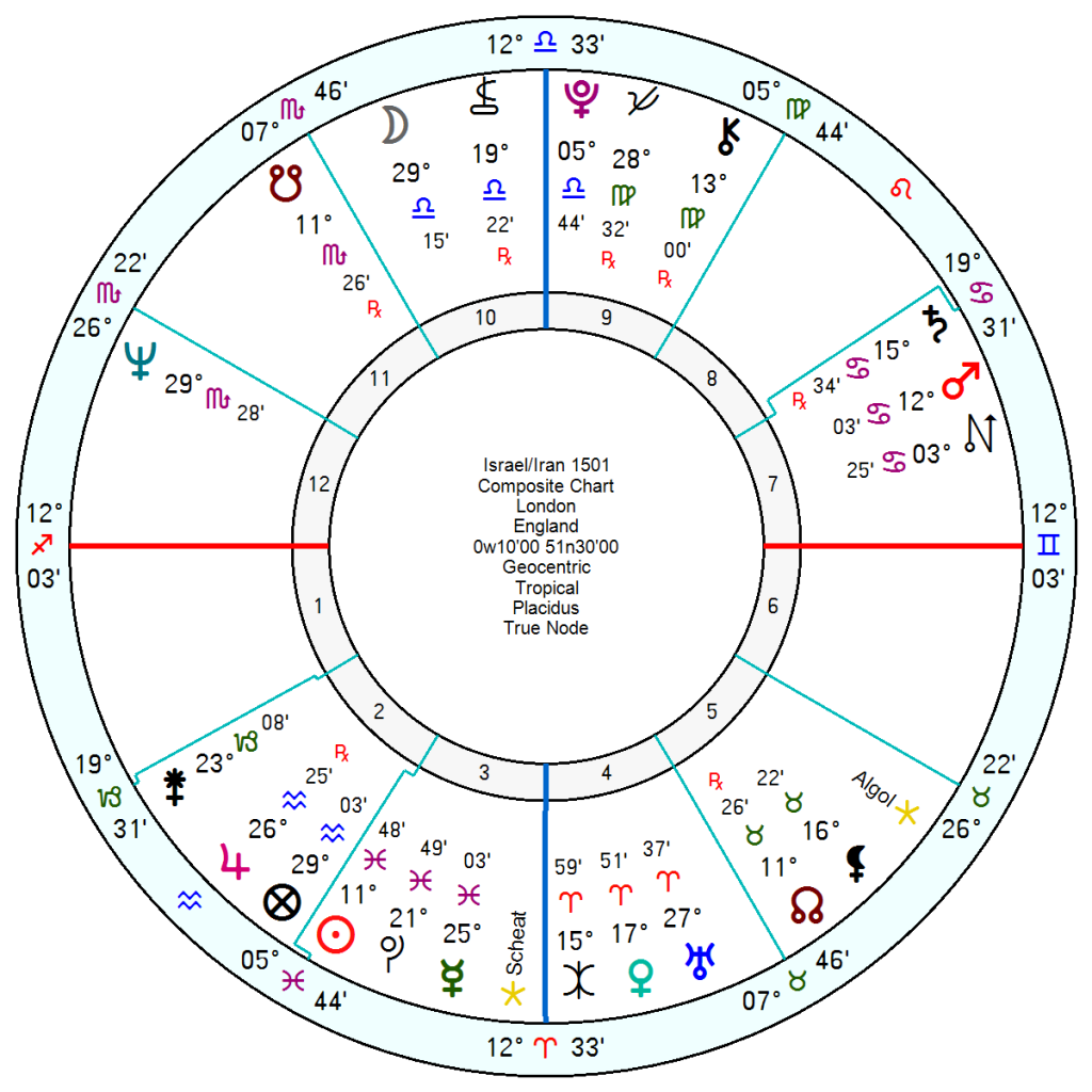 The Israel/Iran relations chart 1501 shows this month of April as truly devastating with Uranus opposing composite Neptune. With slip and slide 2027; and major unrest and further disruption in 2028 when Uranus squares the composite Sun and much worse in 2030/31 with Neptune square the openly hostile and bellicose conjunction of Saturn and Mars.