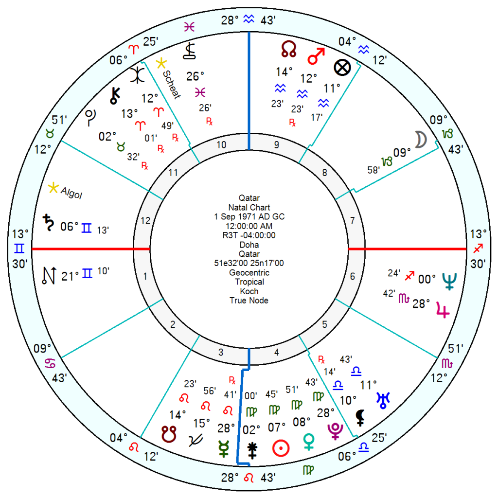 Both the United Arab Emirates and Qatar, founded in 1971, are having to deal with Uranus opposition to their Neptune and its conjunction with Saturn this year and next, which will make them nervous and for both, Uranus moves in hard aspect to their respective Sun in 2027/28, so this is a phase of big surprises. Qatar appears seriously aggravated and locked in conflict during 2030/31 with Pluto conjunct Mars. The United Arab Emirates appears to be in the process of merging in 2031/32 with its Solar Arc Pluto opposite Saturn and conjunct Neptune.