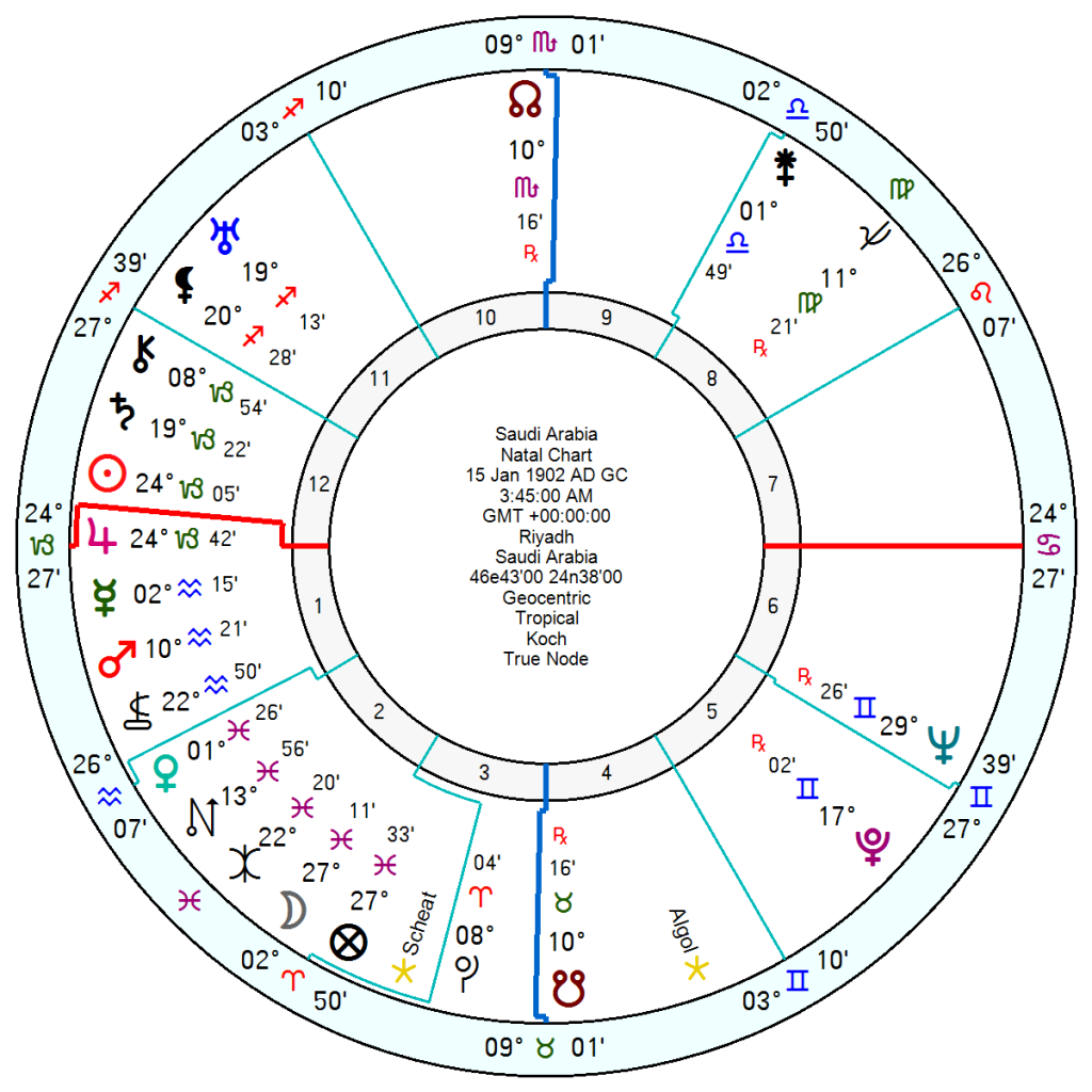Saudi Arabia, January 15, 1902, 3:45 am Riyadh, will face a blockade along with fear and frustration between 2029 and 2032, when Mars SA conjuncts Pluto and its opposition Uranus; with a hint before then, in 2028, of an opportunistic impulse that could produce luck but could also go the other way as Uranus SA squares its Sin Jupiter.