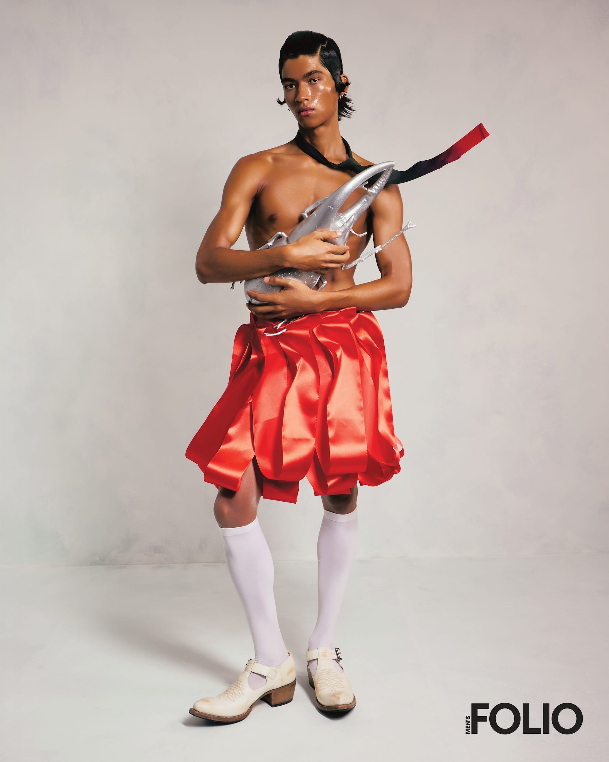 Tie, Jil Sander via Club 21; Bag, Uzair Shoid; Shoes, Prada; Skirt, socks, stylist’s own.