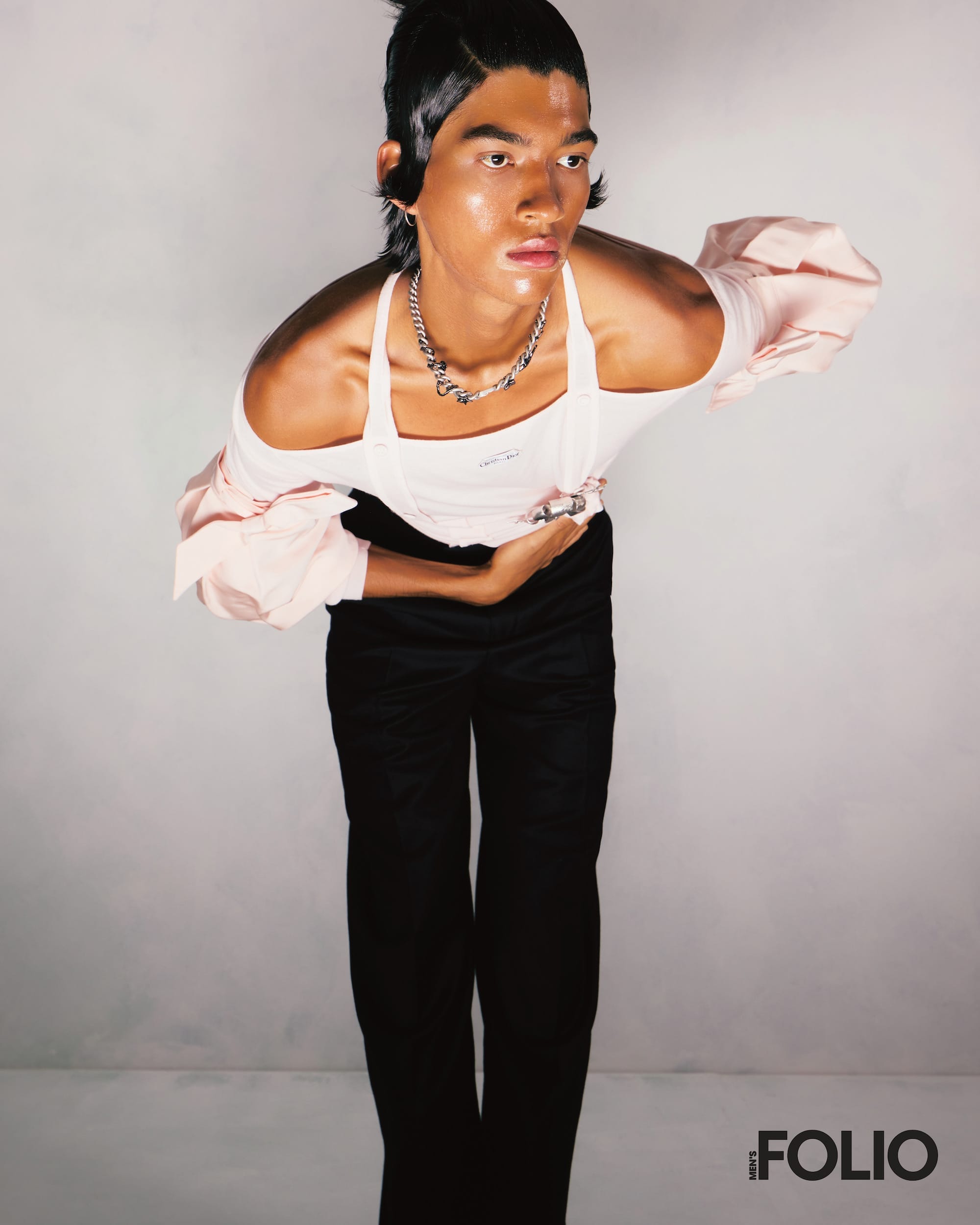 Top, sleeve cuff (worn around the arm), pants, necklace, brooch, everything Dior Men