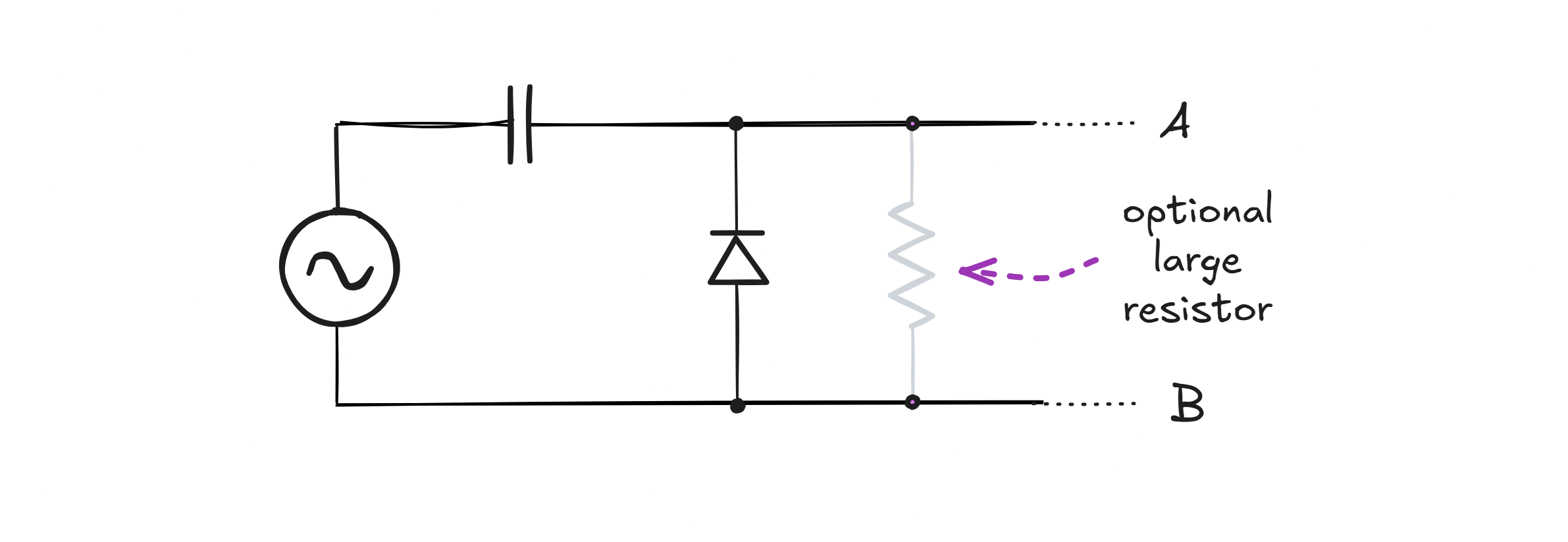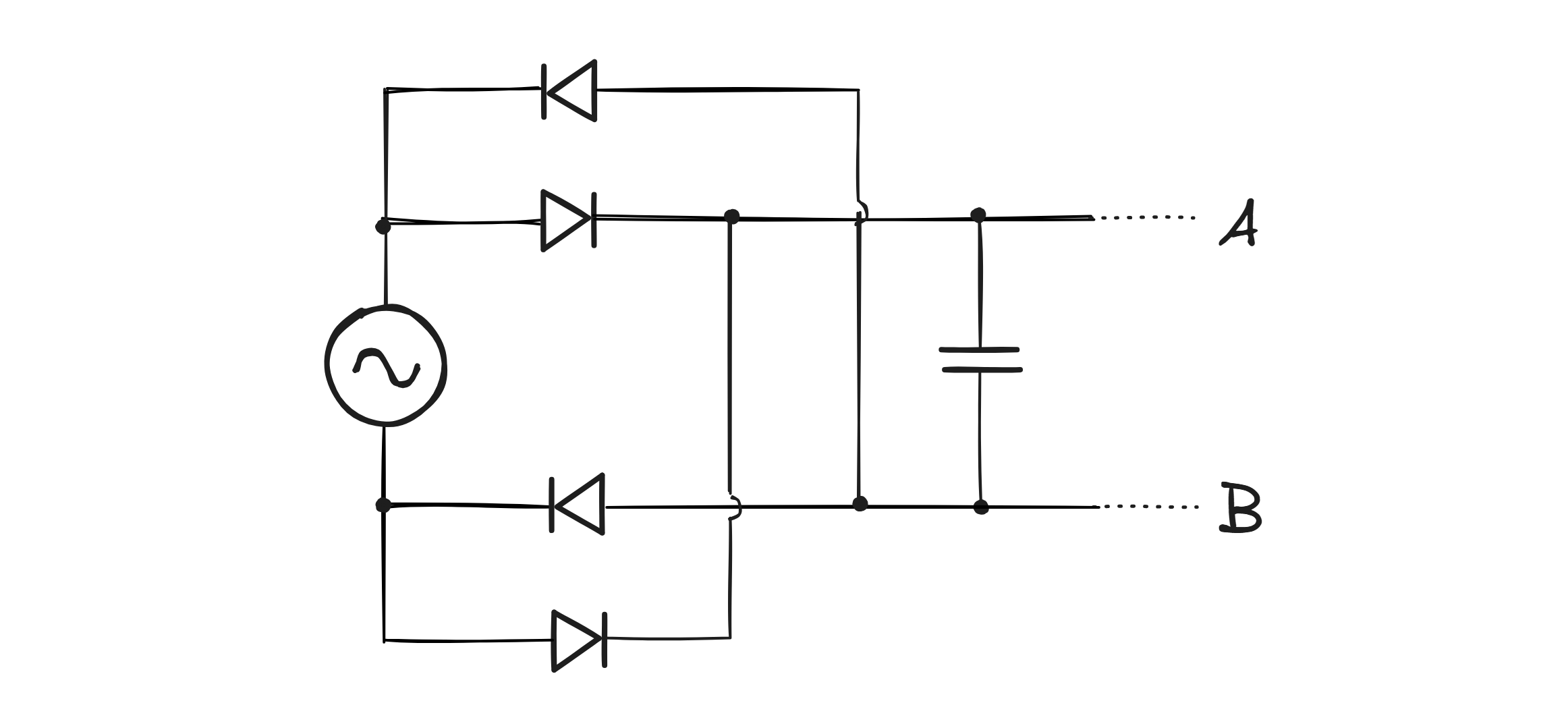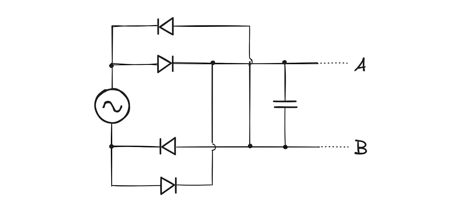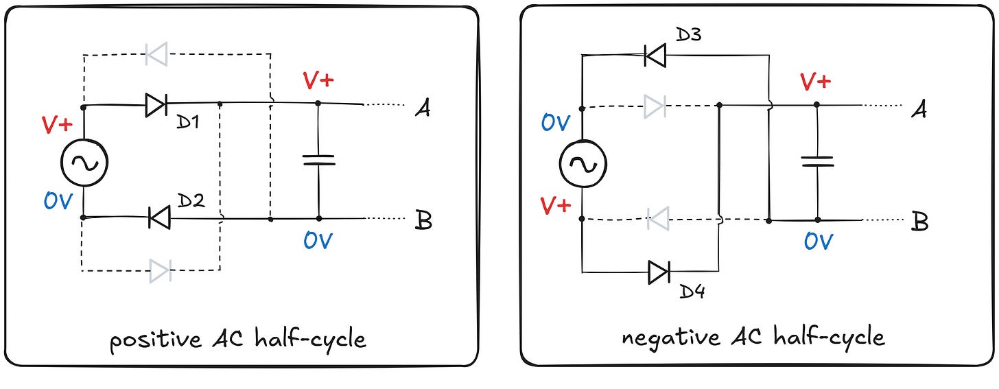During the positive half-cycle, diodes D1 and D2 are initially forward-biased; this allows the capacitor to charge to the AC peak voltage (minus the summed voltage drop of two diodes). During the negative half-cycle, diodes D3 and D4 become forward-biased, which connects the output B to the upper supply terminal. Meanwhile, the bottom supply terminal, which is currently at a higher voltage, is connected to point A. This allows the capacitor to continue charging in the same polarity as before.