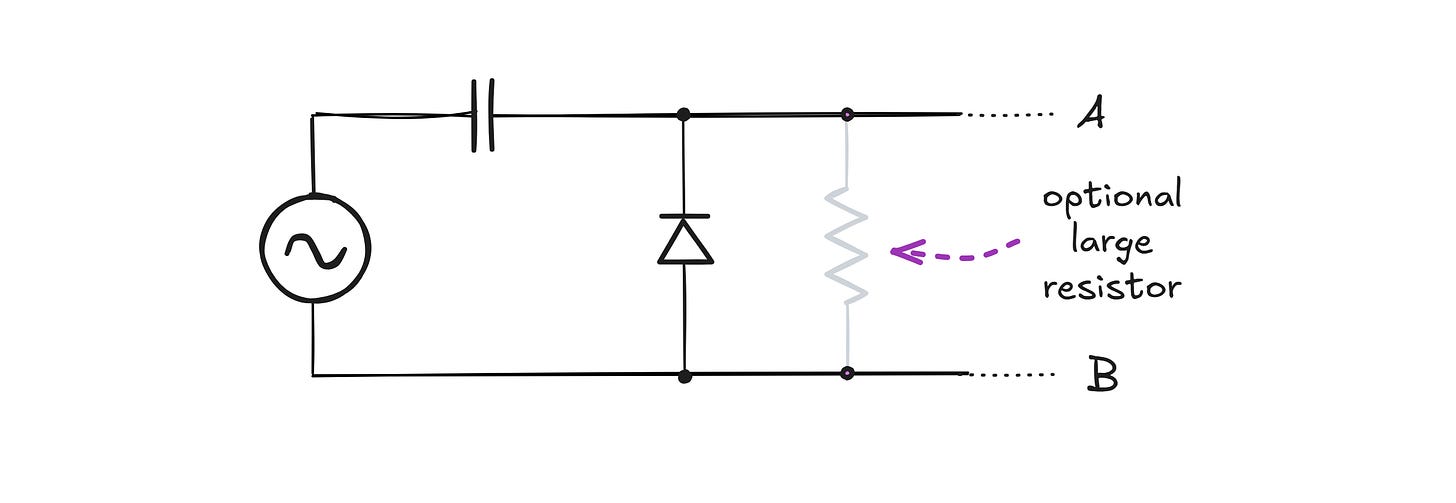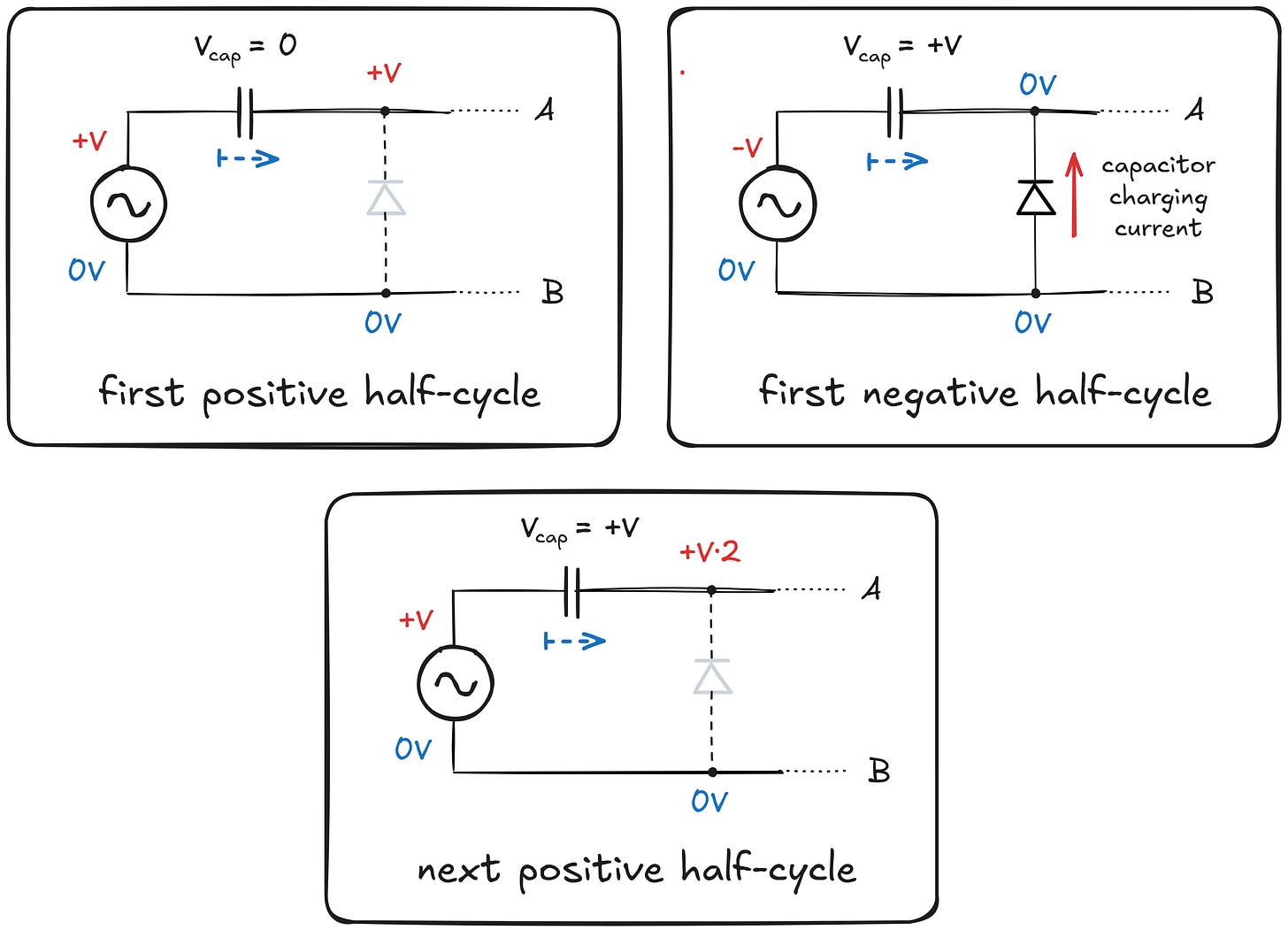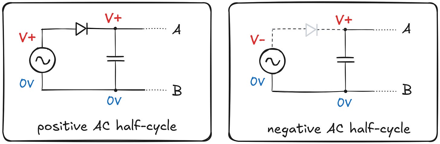 In the following negative half-cycle, once the voltage at point A reaches about -600 mV, the diode starts to conduct (top right). This clamps the voltage at point A while simultaneously allowing the capacitor to charge so that its left terminal becomes negative in relation to the right terminal. If we measure Vcap left to right, the resulting voltage is positive and is equal to the peak amplitude of the supply signal (minus the diode voltage drop).