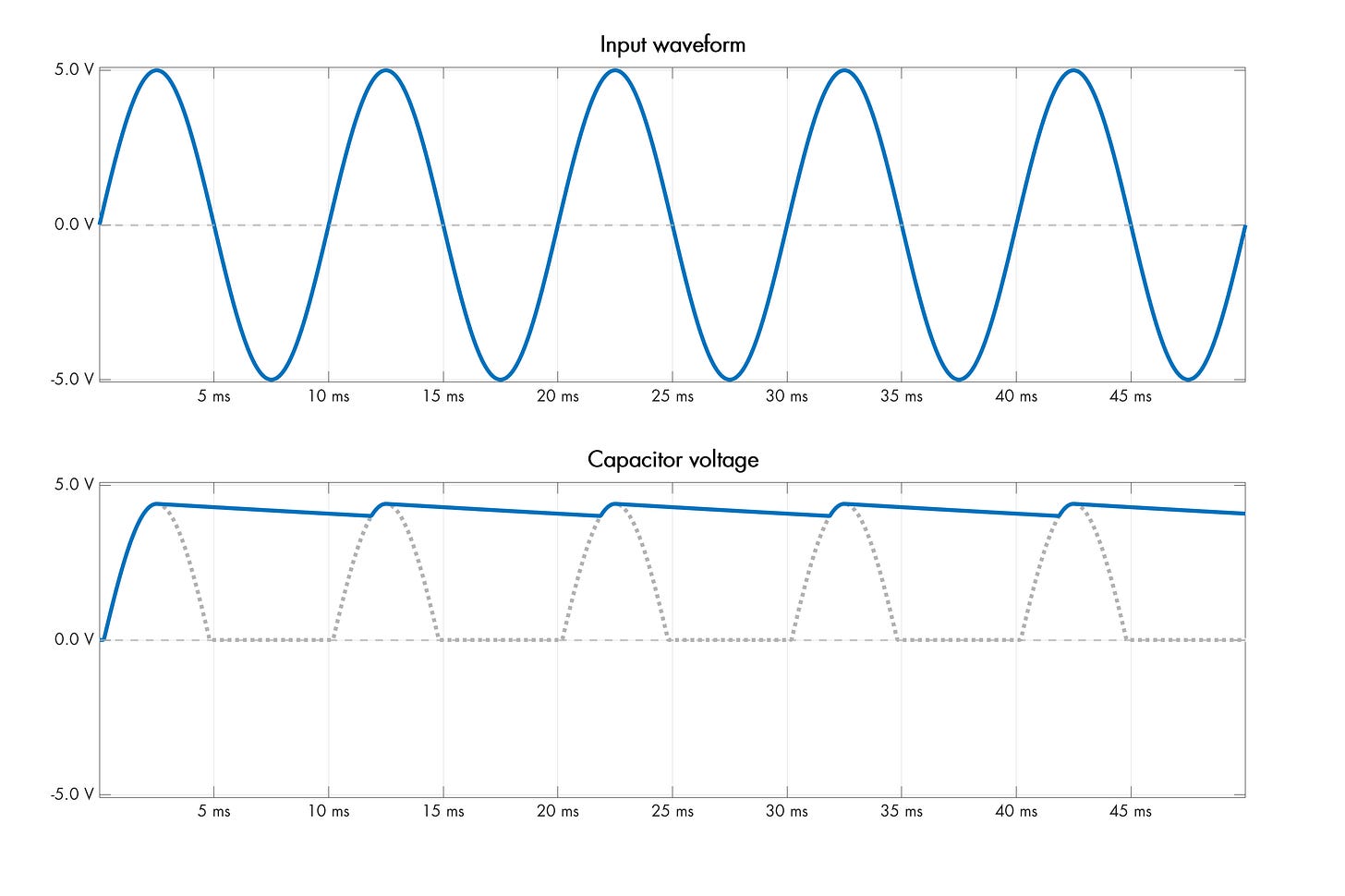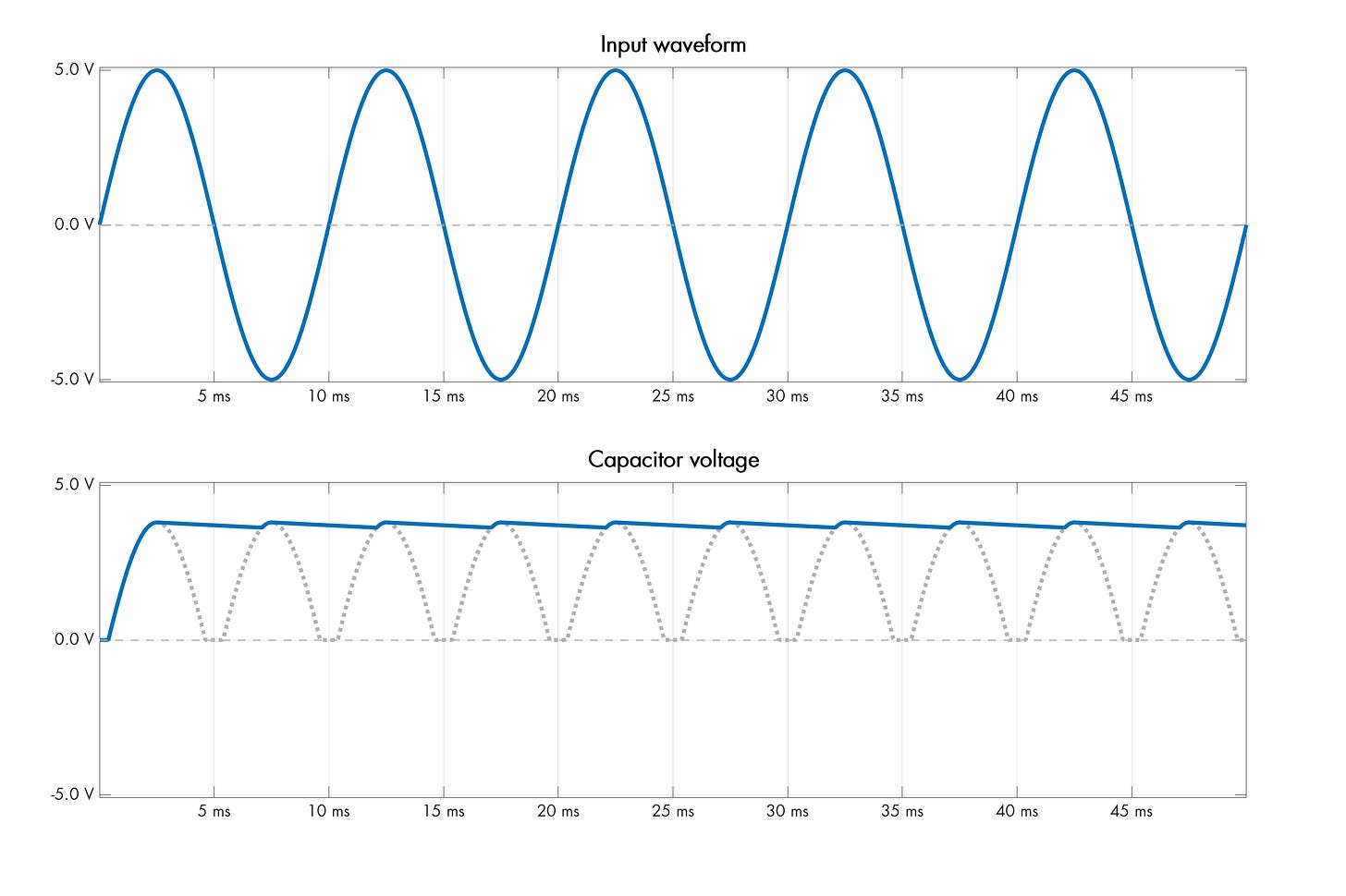 When the polarity of the signal is reversed – making the upper supply terminal more negative – the diode becomes reverse-biased and doesn’t conduct, so the capacitor holds charge. The following is a discrete-time simulation of the process; I added a modest resistive load across the output terminals to discharge the capacitor slightly in between each positive peak:
