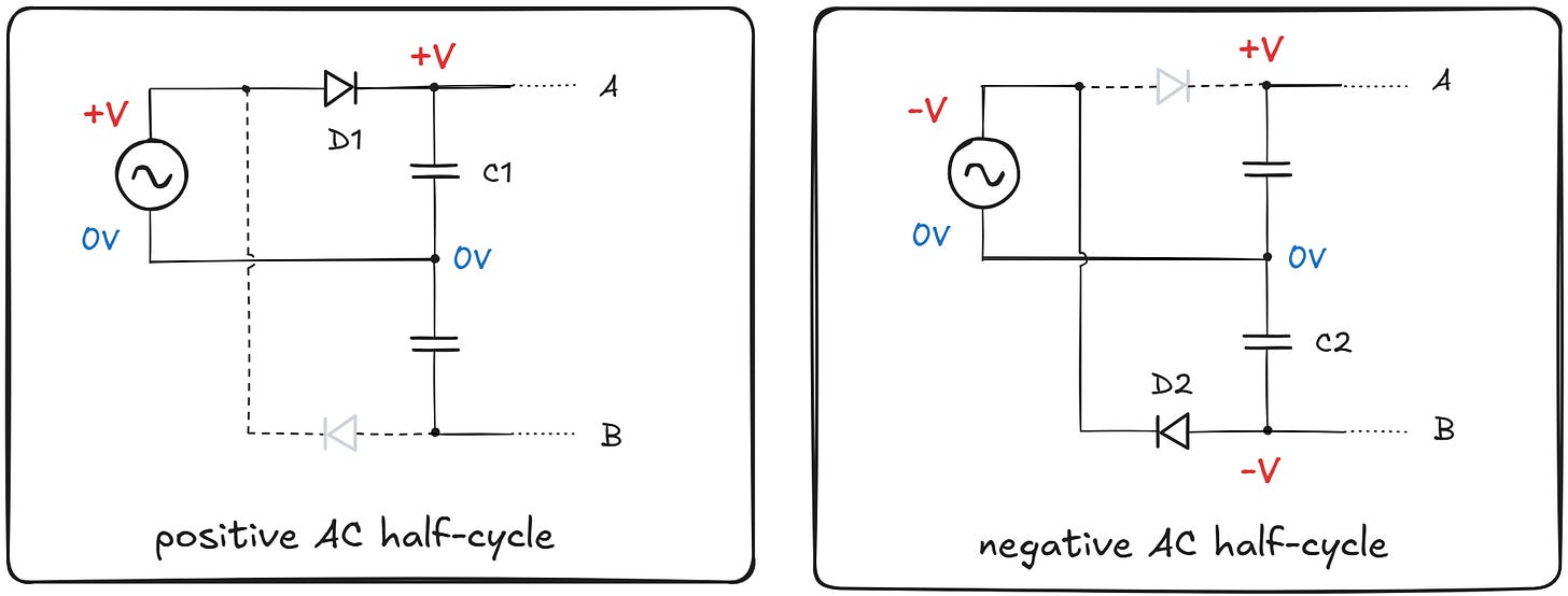 Next, let’s have a look at the negative half-cycle (right). In this scenario, the top diode is always reverse-biased, so it doesn’t conduct; C1 retains charge. At the same time, conduction is possible for the lower diode D2, which charges C2 so that the output terminal B ends up at a negative voltage in relation to the midpoint. In effect, we store the positive peak voltage of the input waveform in C1 and the negative maximum in C2. The total voltage between B and A is Vpeak · 2 (once again, minus the expected diode voltage drops).
