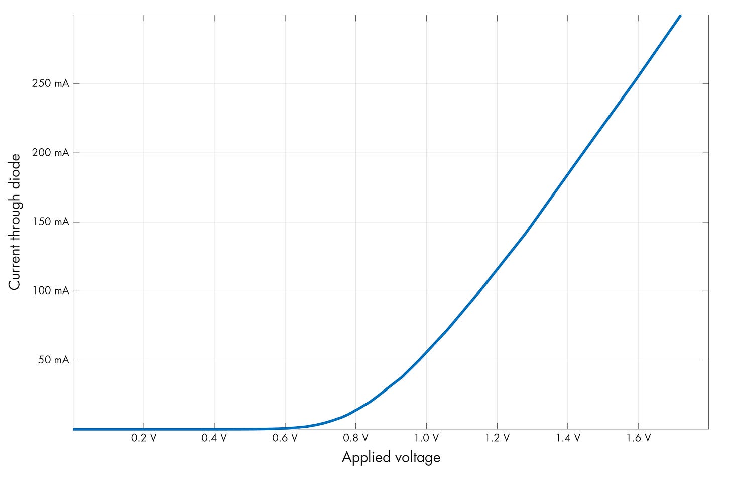 A conventional diode is just a p-n junction. The component can be thought of as a rudimentary voltage-controlled gate: when the voltage is below a certain threshold, it presents itself as a very high resistance — typically in excess of 100 kΩ — so virtually no current can flow. When the threshold is cleared, the diode admits current that’s roughly proportional to the “excess” applied voltage, an ohmic behavior that’s a consequence of the resistance of the material itself:
