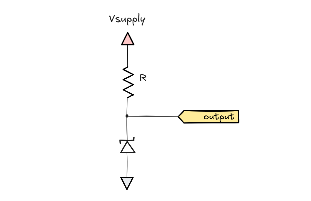 This observation lends itself to the use of diodes as voltage references. We take an unregulated power supply — for example, a battery — and in the simplest variant, use a resistor to roughly limit the current flowing through the diode. Depending on the voltage you want, you can use one or more forward-biased diodes, a Zener diode, or some combination thereof.
