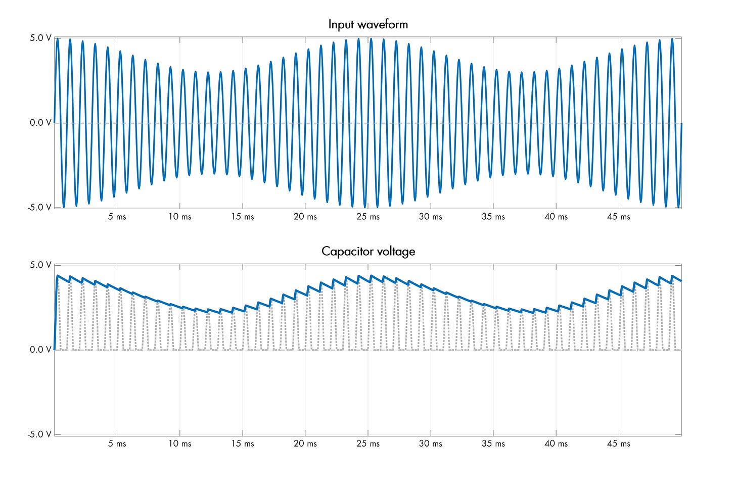 The same principle can be used if we want to build a circuit that measures the approximate loudness of an audio signal, or more generally, hones in on the slow-changing component of any composite waveform.