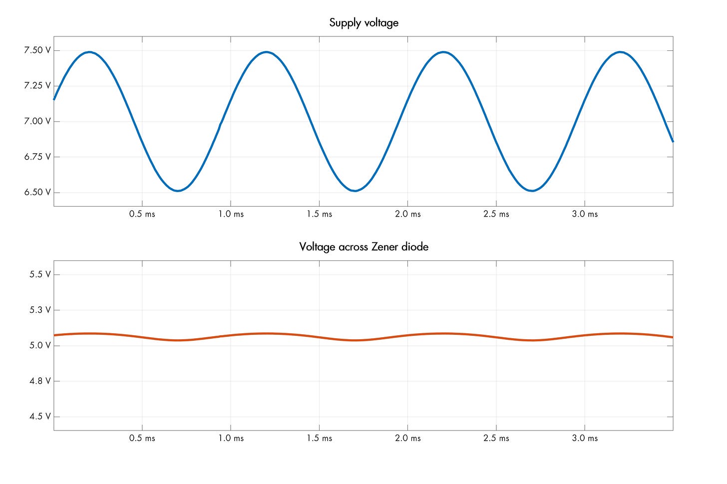 From Ohm’s law, the current admitted by the resistor will change linearly with the supply voltage (I = V/R), but these current fluctuations affect the diode voltage to a much lower extent. Here’s an experimental plot for the circuit constructed with a 1N4733 diode and a 100 Ω resistor: