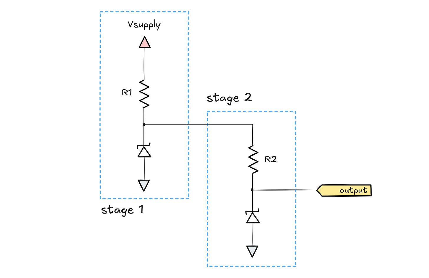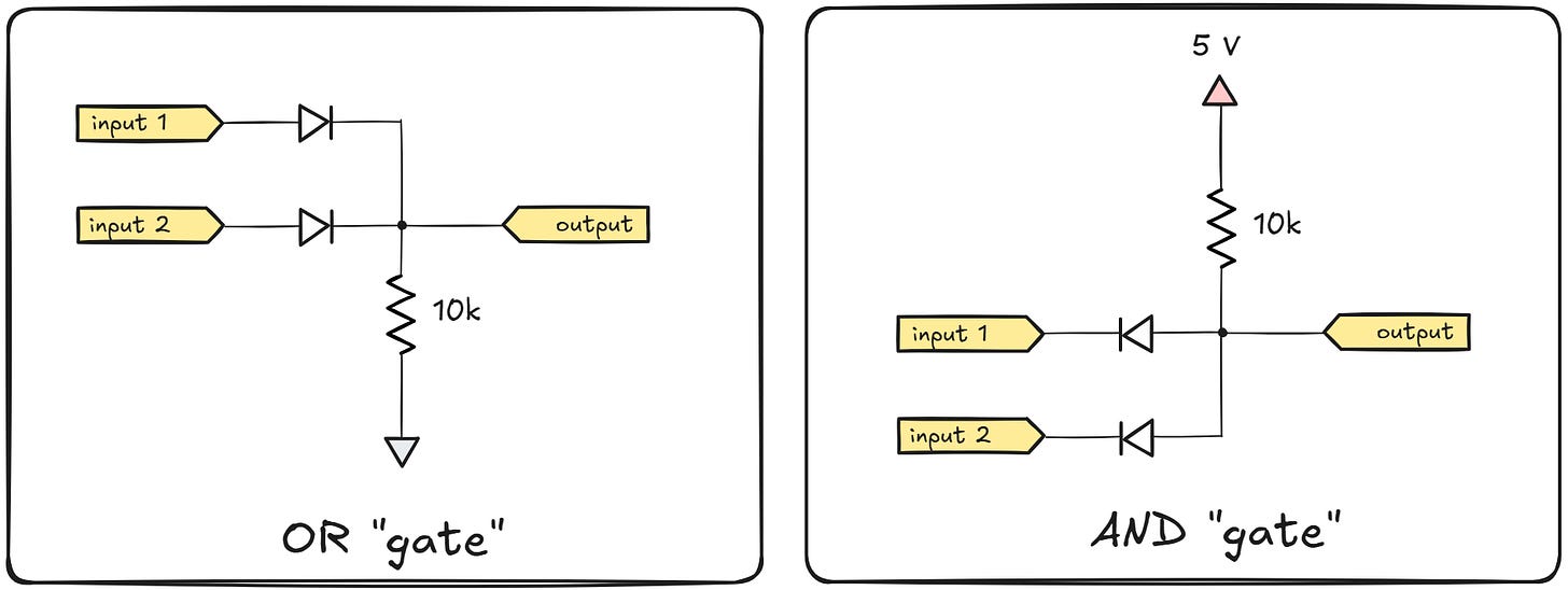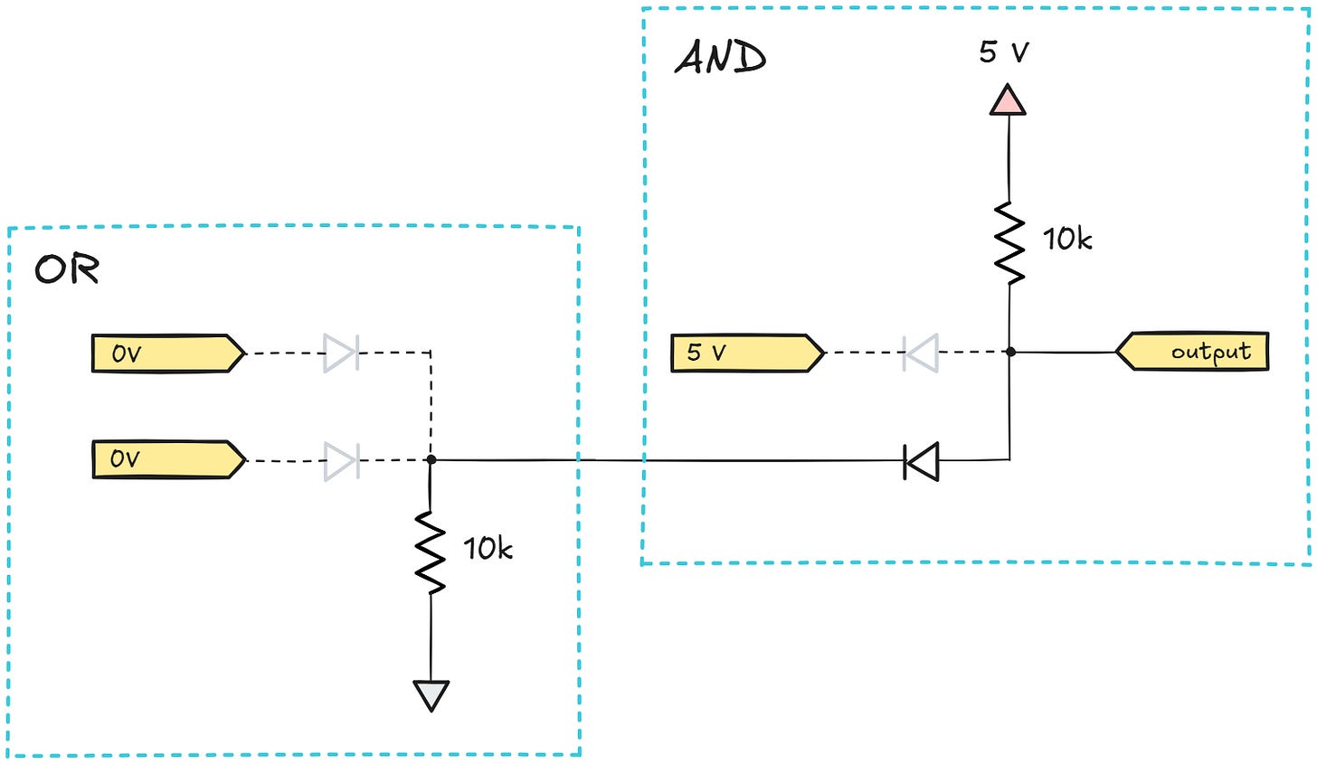 The reason I put “gate” in scare quotes in the illustration is that the circuits are not readily composable to implement more complex digital logic; each of the gates requires current to flow through the input terminals, but it can’t necessarily deliver such currents on its output leg. A particularly troublesome situation is shown below: