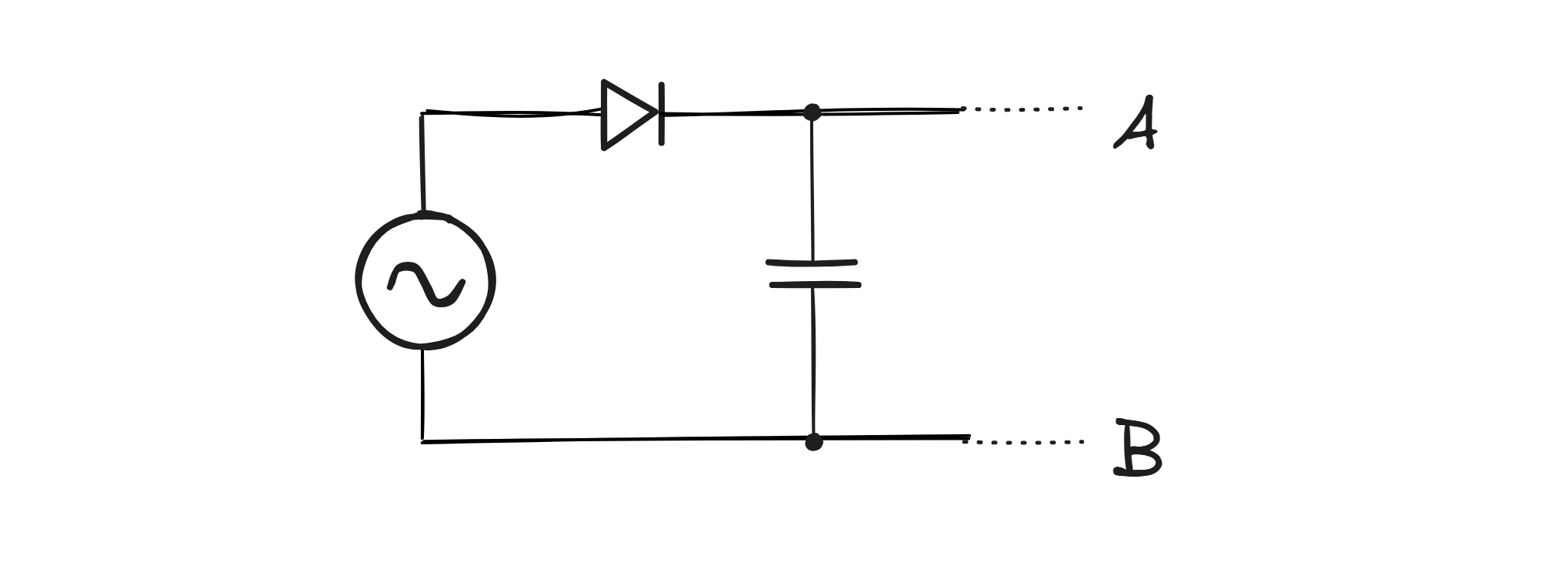 This circuit is called a half-wave rectifier. The analysis is the easiest if we reference all circuit voltages to the bottom output leg marked as B, and then evaluate the positive half-cycle of the input AC waveform separately from the negative half-cycle: