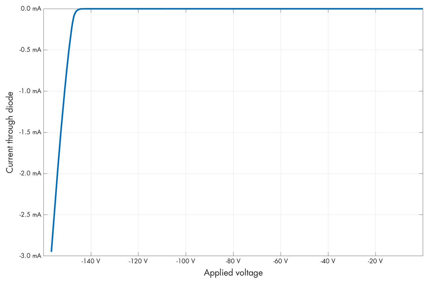 So far, we discussed a condition known as forward bias. If the diode is reverse-biased — that is, if the p-side is more negative than the n-side — the component notionally remains nonconductive. Well… up to a point.
