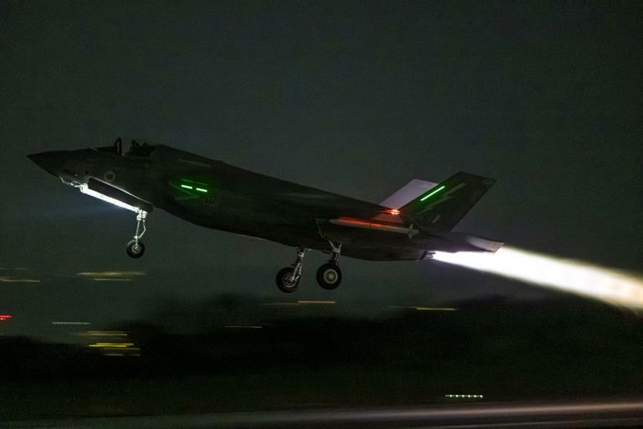 Image of an RAF F-35B aircraft, seen here taking off for operations throughout the Middle East. British aircraft are protecting UK personnel and allied nations across the Middle East by shooting down hostile drones. (Image credit: AS1 Joshua Whiting/Crown Copyright)