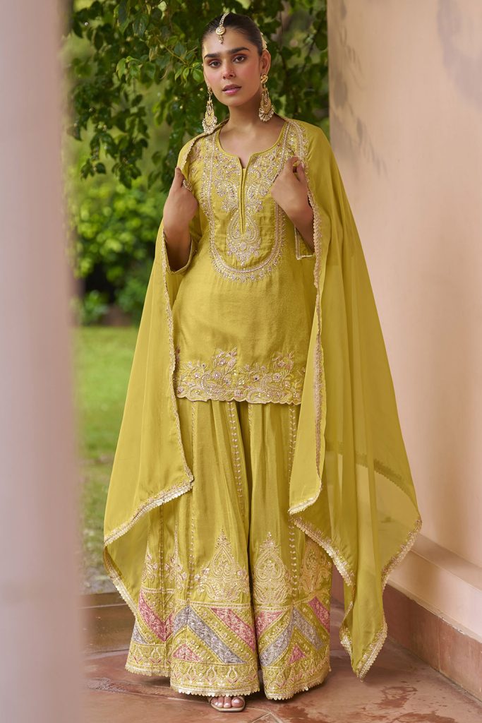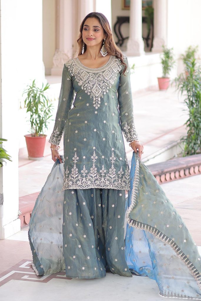 Modern UK-based designers prefer Short embroidered kurtis paired with high waist shararas.often styled with lightweight net or organza dupattas. Color palettes include: